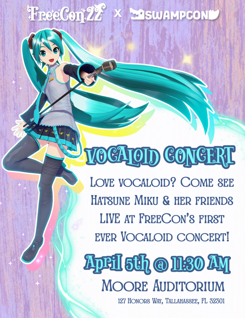 Stop by for FreeCon’s very first Vocaloid concert (in collaboration with SwampCon’s Miku Team) to see Hatsune Miku and her friends live on stage!